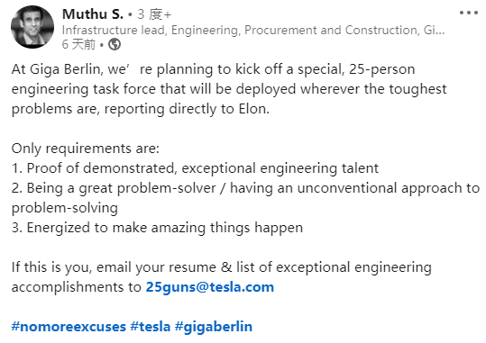 特斯拉柏林工厂工程、采购和建设基础设施负责人Muthu S揭示了其意义:“在柏林超级工厂,我们正计划组建一支由25人组成的工程特遣队,专门解决最复杂的问题,并直接向马斯克汇报工作。”