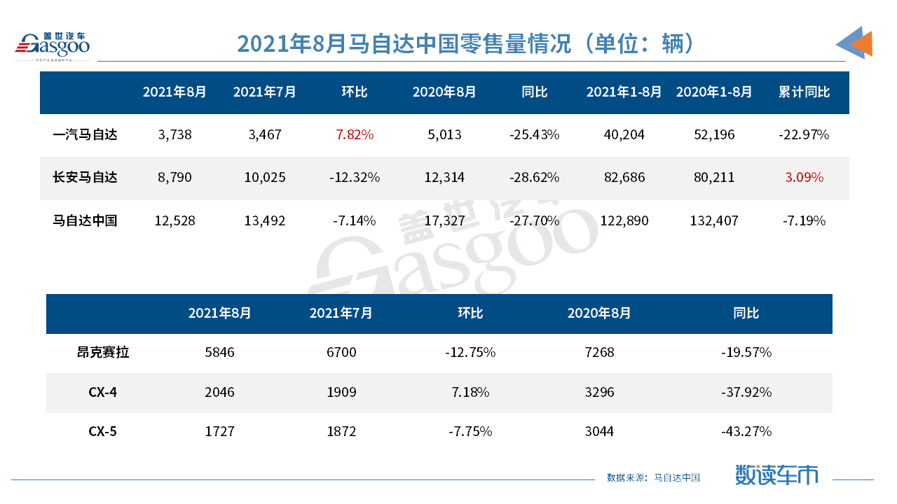按照马自达中国于日前发布的最新销量数据来看,2021年8月其在华零售为12,528台,。两大渠道8月销量情况分别为:一汽马自达销量为3,738台,长安马自达销量为8,790台。不管是其总体还是两大渠道零售同比增速均出现了超过两成的降幅。