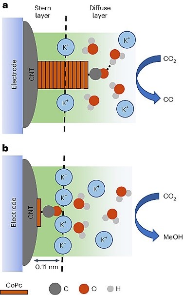 这项技术是通过将酞菁钴(CoPc)分子均匀地涂在碳纳米管(具有独特电性能的石墨烯状管)上实现的。碳纳米管表面是一种电解质溶液,在通过电流后,CoPc分子能够携带电子并利用它们将二氧化碳转化为甲醇。