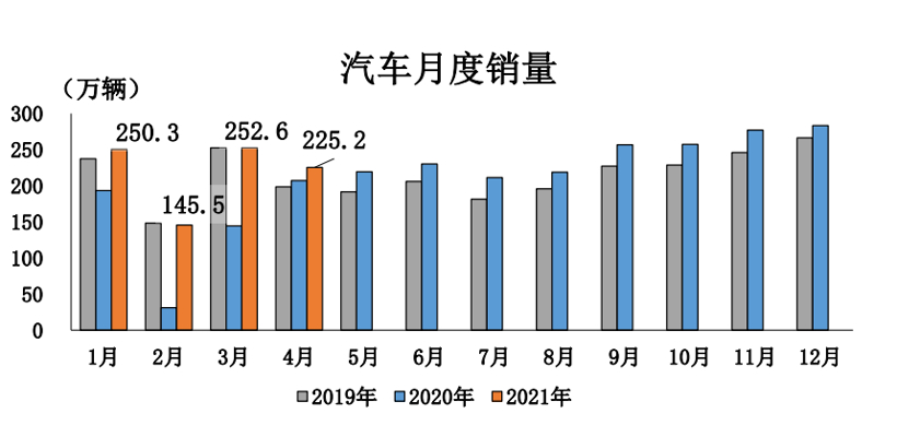 根据中国汽车工业协会(简称“中汽协”)最新一期的产销数据,今年4月,中国汽车产销分别达到223.4万辆和225.2万辆,环比下降9.3%和10.8%,同比增长6.3%和8.6%,同比增速较上月分别回落65.4和66.3个百分点。