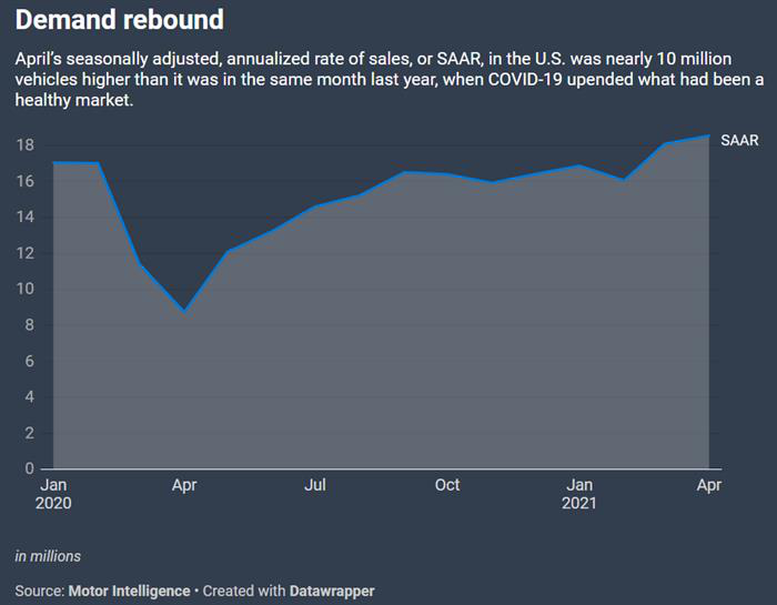 市场研究公司Motor Intelligence称,在政府刺激计划的推动下,美国汽车市场持续火爆,以季节性调整年化销售速率SAAR衡量,4月美国轻型车SAAR销量达到1,850万辆,这是SAAR连续第二个月突破1,800万辆。即,按该月销售速率,今年全年美国轻型车销量将达到1,850万辆。