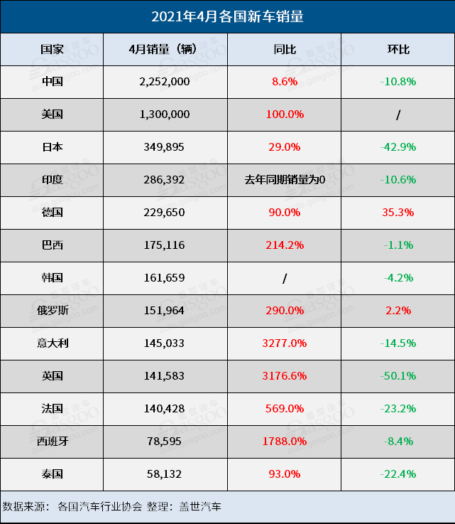 尽管各国汽车销量均实现了同比增幅,但较3月份销量来看,多数国家均出现了不同程度的跌幅,一定程度上是因为愈演愈烈的芯片短缺危机使得汽车产量受限。