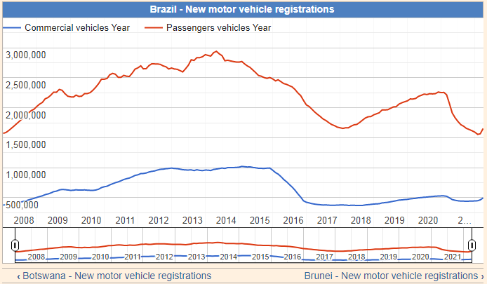 巴西2008年至2021年汽车销量走势(图片来源:countryeconomy.com)