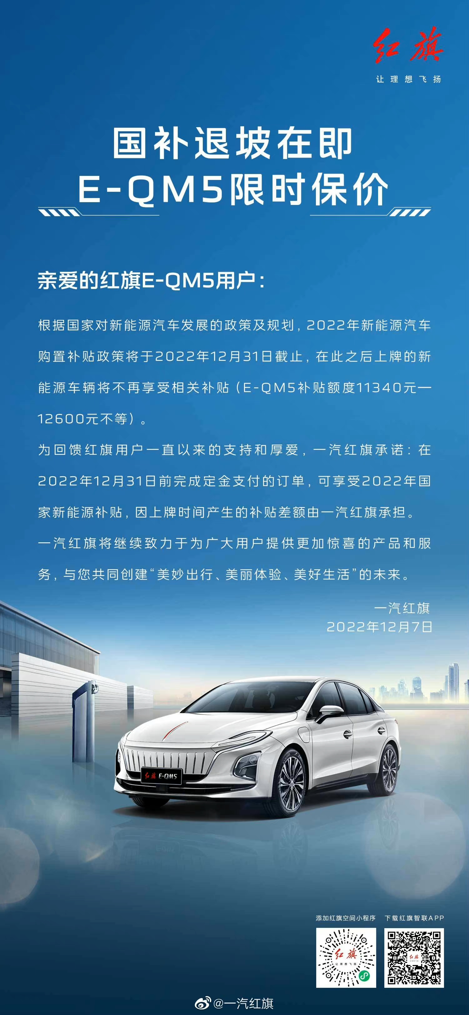 继多家车企推出限时政策后,12月7日,一汽红旗也跟上了脚步,推出红旗E-QM5国补限时保价说明。