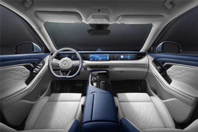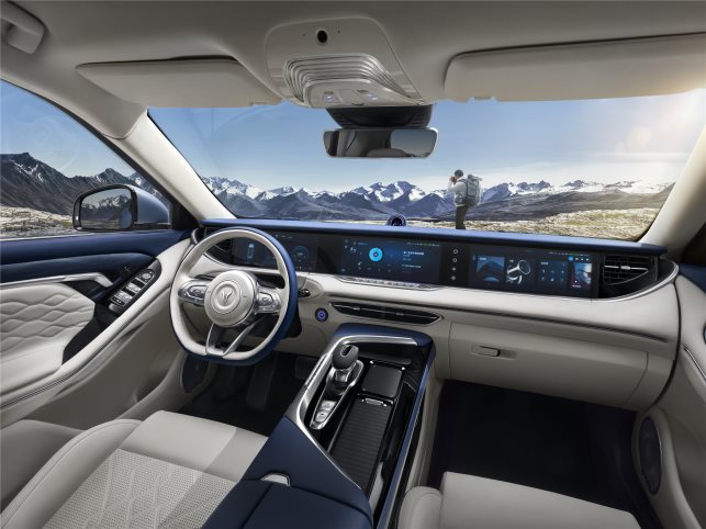 坐进车内,形状复古中又糅合了一丝新颖的方向盘手感极佳。独此一份的中控台一体式可升降三联屏成为最吸睛的亮点,驾驶中切换到运动模式时屏幕的高度也会随时降低,主色调也会变成更为运动感的黑色;高能模式下的屏幕会为驾驶者提供更为广阔的视野,车机系统与氛围灯也会变成运动红,运动香氛系统散发出的气味将弥漫整个车厢,空气悬架也会自动降低30毫米。